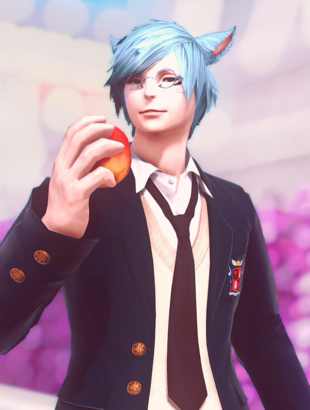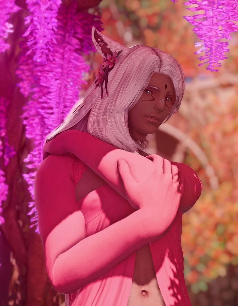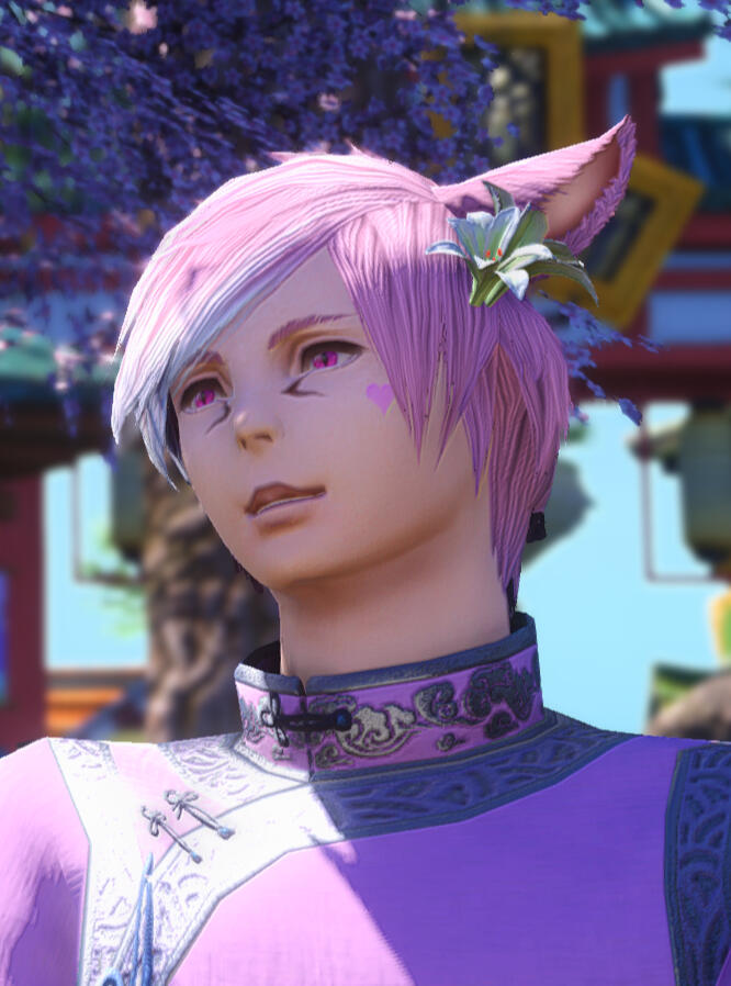 " I’m Amare’sae! I’m a Keeper Miqo’te with Sharlayan heritage although I was raised in Ishgard. I’m the 10th and youngest child in my rather large family, they mean well although they sheltered me from hardships, it did give me a soft heart which I am thankful for. I made my initial way in life as a professional chef to nobles, I love cooking and making drinks, I’m always joyful whipping something up in my spare time! Since leaving Ishgard to travel, I discovered my aptitude for magic. One of my sisters told me I have a dangerously high amount of aether in my body, but it makes my eyes aqua blue, plus they sparkle and glow in the dark so it’s a fair trade to me heh. I now use my natural magical talent channeling it through the stars to heal those unfortunate and injured wherever my travels take me. Personally I adore making friends, my bright pink colour scheme people seem to love! If you ever need a hug or more I’ll be glad to be a loving friend, I’m told my silky soft skin helps the hugs feel special! "